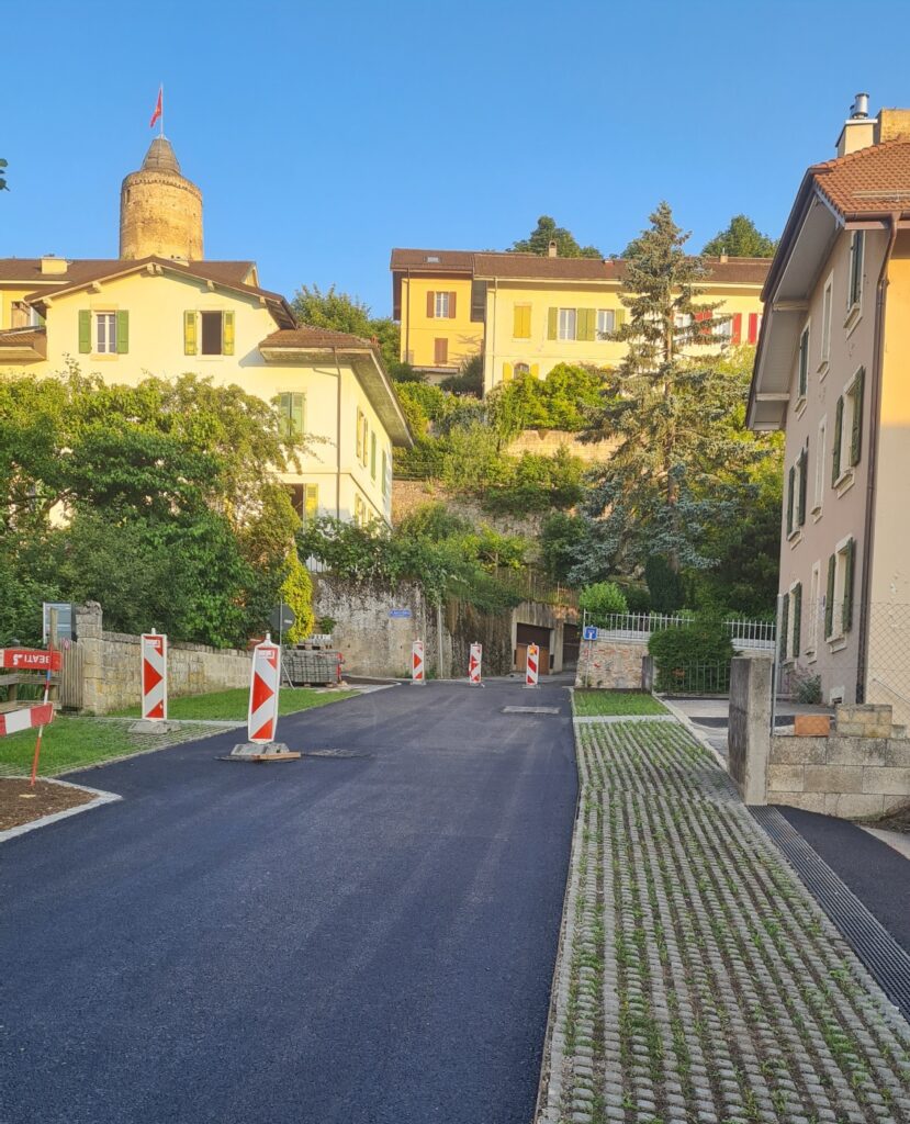 A la demande de la Commune d’Orbe, plusieurs thématiques ont été traitées de manière à adapter l’espace publique. En coordination avec les services, les conduites souterraines ont été déplacées pour laisser place aux arbres et les aménagements de surfaces ont été repensés ;